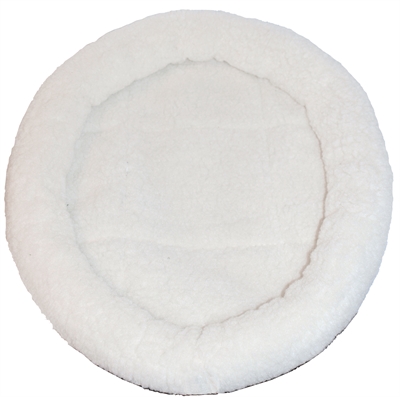 Zachte wollige slaapmand van imitatie schapenwol voor de kat. Het mandje heeft een doorsnede van 48 cm.