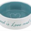 Vul deze voerbak met eten en jouw lieveling zal hem gretig leegeten. Op de voerbak staat in petrol kleurige letters de tekst "All you need is Love and a pet".