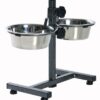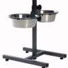 Hondenstandaard inclusief 2 RVS voer/waterbakken. De standaard heeft de vorm van een H en is uitgevoerd in een metaal met hamerslageffect in poedercoating. De standaard is in hoogte verstelbaar om er voor te zorgen dat de hond de juiste lichaamshouding heeft tijdens het drinken/eten, dit ondersteunt de spijsvertering. Doorsnede van de RVS bakken zijn 15 cm. De onderzijde is voorzien van rubberen voetjes om uw vloer te beschermen.