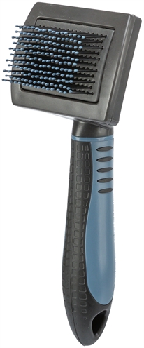 De Trixie Zachte Borstel Met Kunststofborstels En Noppen 7X16 cm is ideaal voor het verzorgen van zowel dekhaar als onderwol. De borstel is uitgerust met zachte kunststof borstels met noppen die effectief losse haren verwijderen en klitten verminderen zonder de huid van je hond te irriteren. Het kunststof handvat met rubberen coating zorgt voor een comfortabele grip en een stevige controle tijdens het borstelen. Perfect voor een zorgvuldige en effectieve vachtverzorging.