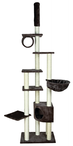 Dat is pas een krabpaal! Deze leuke krabpaal van Trixie is gemaakt om tot plafondhoogte te komen. De krabpaal staat stevig door de plafondspanner en heeft veel speel- en ligmogelijkheden. De katten kunnen kiezen uit diverse plateaus, een ligtunnel, een mandje en een schuilplaats, die bekleed is met heerlijk zacht pluche. De stammen zijn omwonden met natuursisal, zodat jouw kat haar hartelust kan krabben!