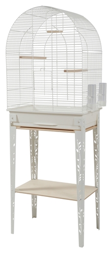 De Zolux Vogelkooi Patio Met Standaard Wit 144 cm is een kooi van metaal en hout voor parkieten, kanaries en andere exoten, in industriële stijl, met schuiflade, zitstokken, schommel en eetbakjes.
